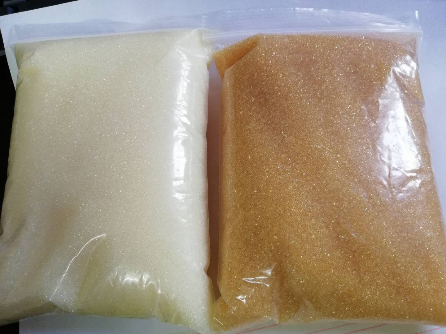 發(fā)生鐵"中毒"的樹脂,從外觀上看,顏色由透明的黃色(陽樹脂)或乳白色(陰樹脂)明顯變深,嚴(yán)重者甚至呈黑色。